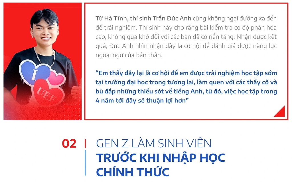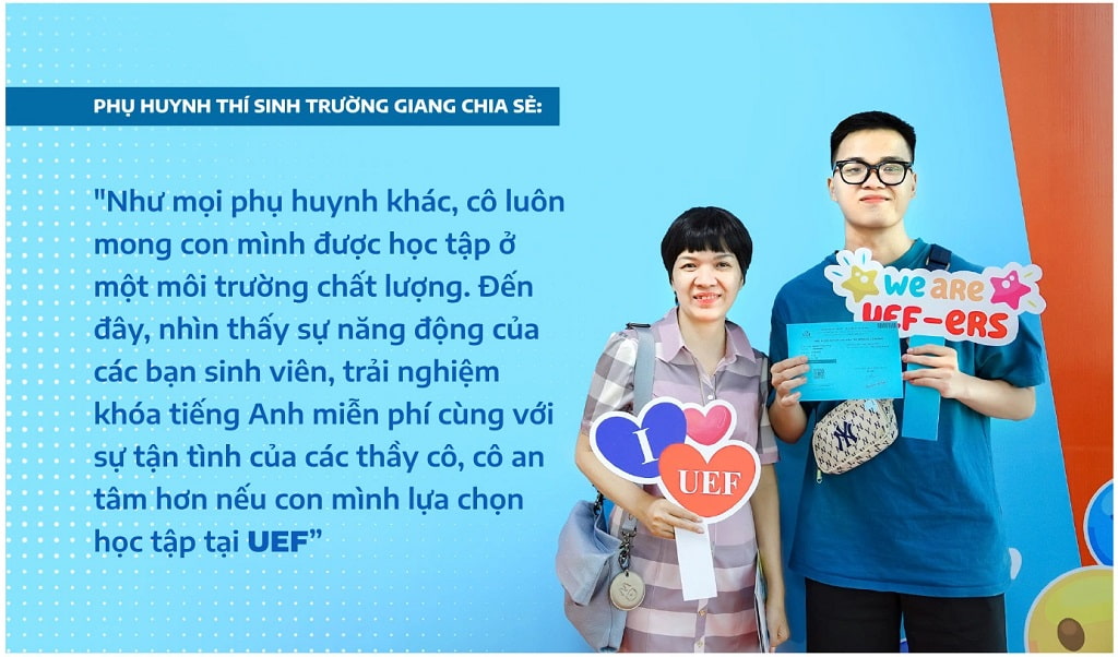 | Các kỳ tuyển sinh hằng năm, Trường đại học Kinh tế - Tài chính TP.HCM (UEF) mang đến những trải nghiệm thực tế cho thí sinh, phụ huynh bằng các hoạt động tham quan cơ sở vật chất, tìm hiểu chính sách học bổng, ưu đãi học tập khác nhau. Năm nay, nhà trường mở rộng và bổ sung thêm hoạt động trải nghiệm tiếng Anh, tiếng Hàn, tiếng Nhật, tiếng Trung cho thí sinh đã, đang và có nhu cầu tham gia xét tuyển vào trường ở 34 ngành nghề đào tạo. Hoạt động này cho thấy nhà trường chú trọng các yếu tố tương tác cho tân sinh viên tiềm năng. Ở giai đoạn khởi động, thí sinh và phụ huynh đã trực tiếp có mặt tại UEF và trực tiếp tham gia vào các hoạt động tiền đề của khóa học đã có những chia sẻ khi lần đầu đặt chân đến trường cùng con em mình.
