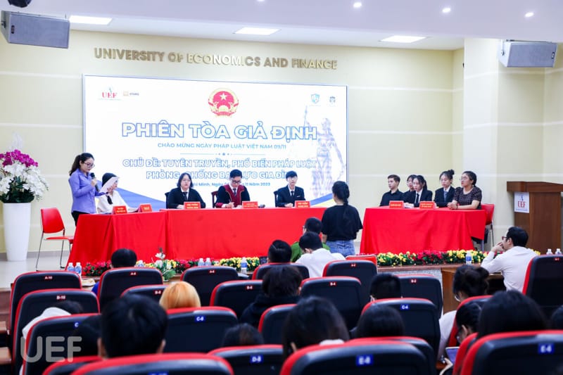 Một “đặc sản” của ngành Luật UEF được tổ chức thường xuyên và cũng là sân chơi để các bạn sinh viên thể hiện kỹ năng nghề nghiệp ngay khi còn trên ghế Nhà trường đó chính là Phiên tòa giả định. Tại đây, sinh viên “hóa thân” thành các Luật sư, Thẩm phán để giải quyết các vụ án và tuyên truyền pháp luật tại nhiều địa phương.