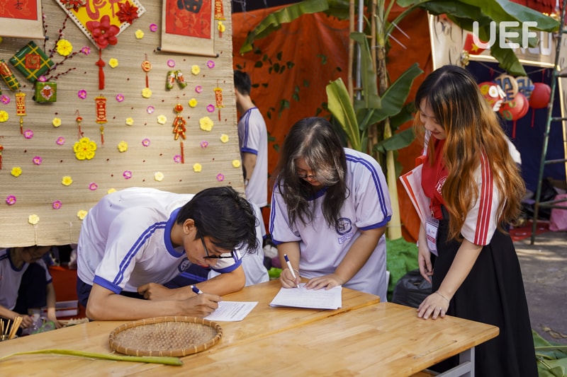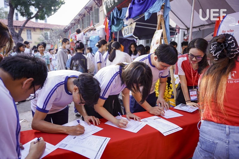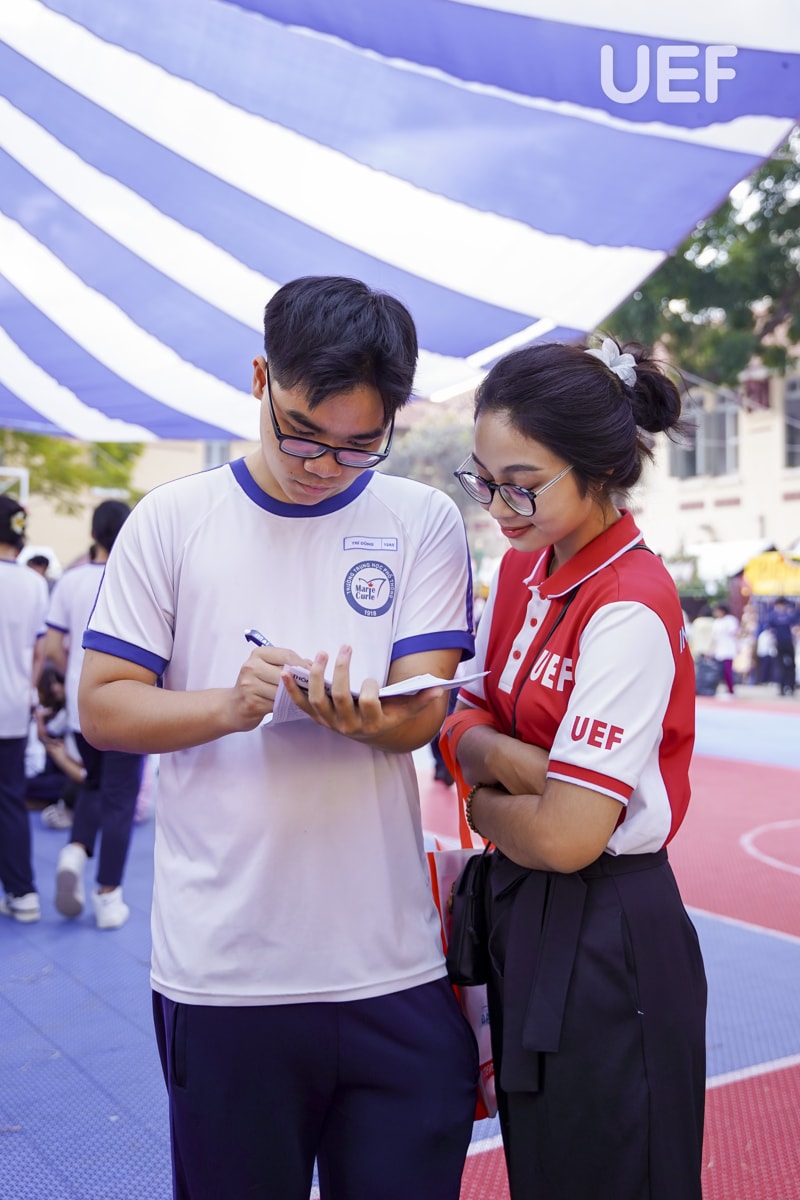 Trong không khí của trại xuân, các bạn học sinh khối 12 Trường THPT Marie Curie vẫn dành sự quan tâm đặc biệt cho UEF khi đến gian tư vấn tìm hiểu các thông tin của trường. Bên cạnh cơ sở vật chất hiện đại, ngành học đa dạng, môi trường song ngữ, chương trình quốc tế,... 2k7 đã được ban tư vấn gỡ rối các vấn đề liên quan đến xét tuyển học bổng sớm - một trong những điểm mới trong kỳ tuyển sinh 2025 của UEF nhằm giúp thí sinh có thể tính linh động trong việc nắm bắt cơ hội học tập chất lượng.