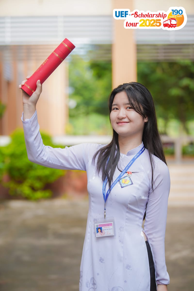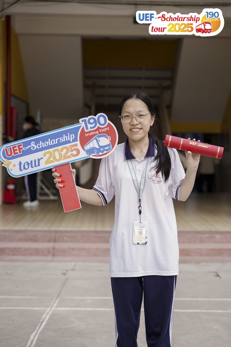 “Em rất vui và bất ngờ khi nhận học bổng 100% của UEF. Điều này giúp em giảm bớt áp lực trước kỳ thi và hỗ trợ một phần tài chính cho gia đình. Chính sách này giúp thí sinh thuận lợi hơn khi định hướng nghề nghiệp và chọn trường đại học. Đặc biệt, việc trao trực tiếp học bổng cho thí sinh cho thấy UEF trân trọng và nhiệt tình với chúng em, em rất xúc động vì điều đó”, bạn Nguyễn Mai Thúy Phương - Lớp 12.7 trường THPT Tân Hiệp (Tiền Giang) nhấn mạnh. Cô bạn 2k7 đã đăng ký vào ngành Tâm lý học, Tài chính - Ngân hàng, Logistics và quản lý chuỗi cung ứng tại UEF.