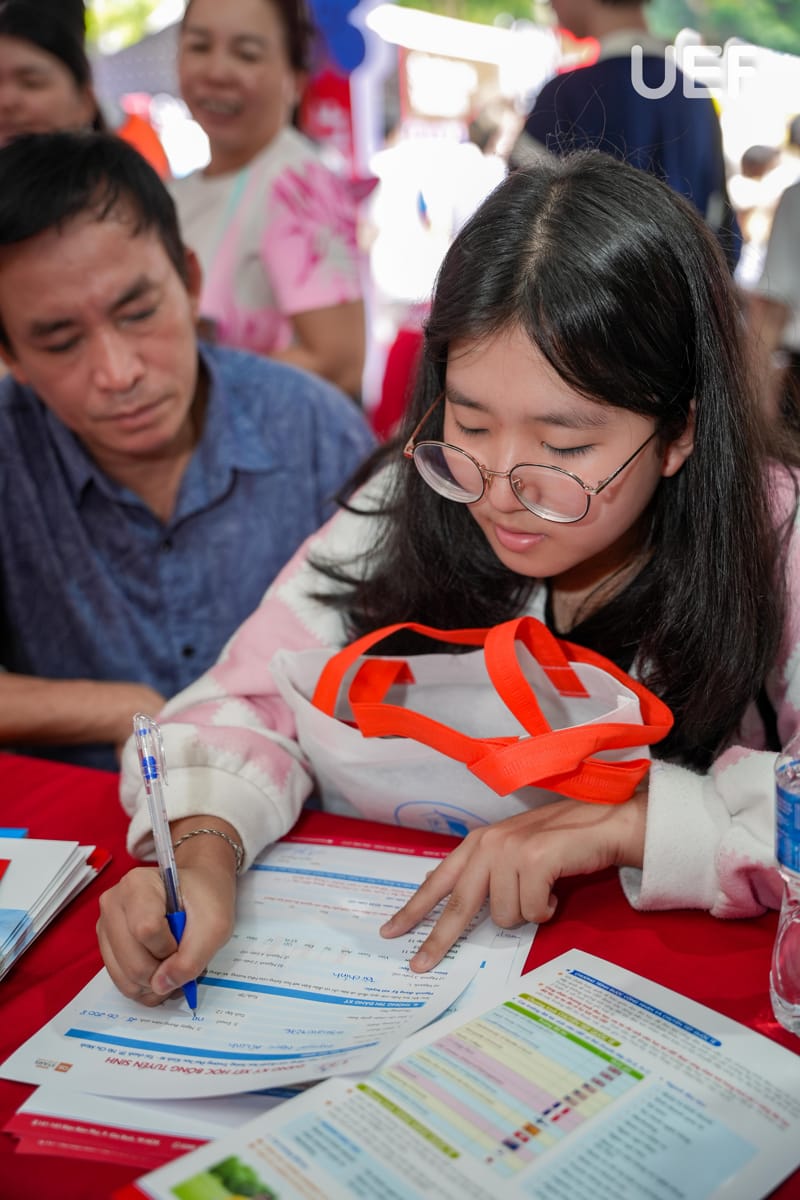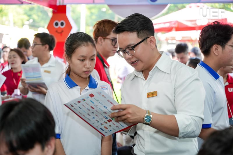 Tại khu vực của Nhà UEF, phụ huynh và thí sinh được ban tư vấn cung cấp những thông tin mới nhất của kỳ tuyển sinh năm 2026, các phương thức tuyển sinh của UEF, chương trình đào tạo, môi trường học tập song ngữ quốc tế, cơ hội việc làm sau tốt nghiệp,... Gian tư vấn dành cho chương trình liên kết quốc tế của UEF nhận sự quan tâm của team 2k8, đặc biệt là các bạn có thế mạnh tiếng Anh.