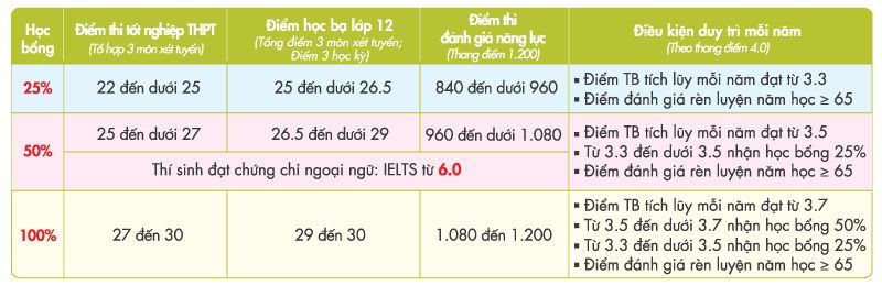 Thí sinh đăng ký xét tuyển vào UEF có cơ hội nhận được các suất học bổng tương ứng 100%, 50%, 25% giá trị học phí.