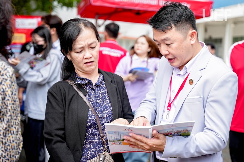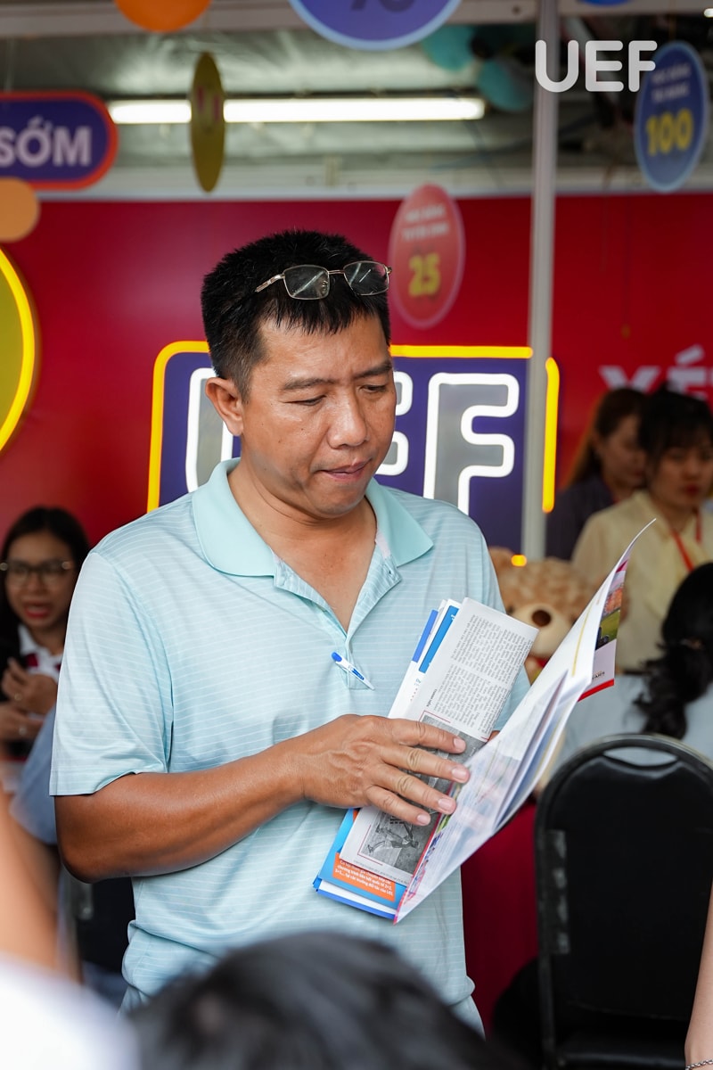 Đến từ Long An và dành nhiều thời gian tại gian tư vấn của trường, cô Nguyễn Thị Bích Ngọc, phụ huynh của bạn Phan Vịnh Nghi (tỉnh Long An) đã cùng chồng tìm hiểu cặn kẽ các thông tin về kỳ tuyển sinh 2025 nói chung và UEF nói riêng. Ngoài những thông tin về môi trường đào tạo song ngữ, quốc tế, cô ấn tượng bởi chính sách xét học bổng sớm. “Tôi nhận thấy chính sách xét học bổng sớm sẽ giúp thí sinh và phụ huynh có sự an tâm về tài chính” - cô chia sẻ.