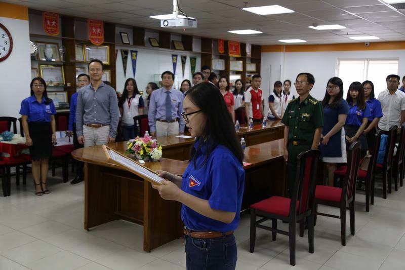 Đồng chí Phạm Hoài Thanh Trang đọc lời tuyên thệ trước sự chứng kiến của Đảng bộ Nhà trường